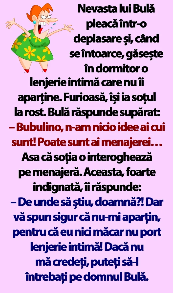 – De unde să știu, doamnă?! Dar vă spun sigur că nu-mi aparțin, pentru că eu nici măcar nu port lenjerie intimă! Dacă nu mă credeți, puteți să-l întrebați pe domnul Bulă.