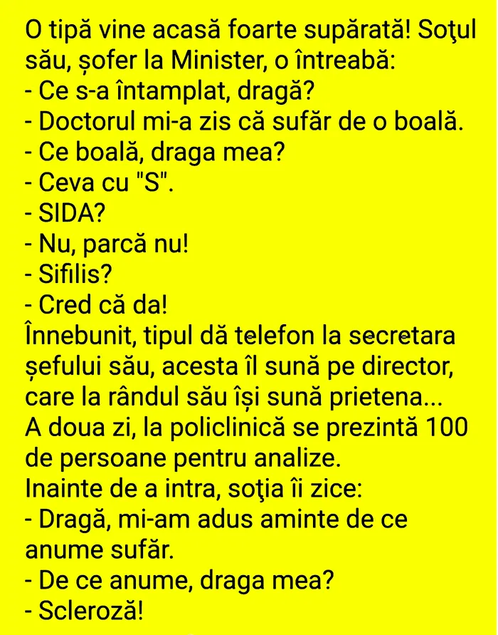 O tipă vine acasă foarte supărată, iar soțul său, șofer la un minister, o ia la întrebări: