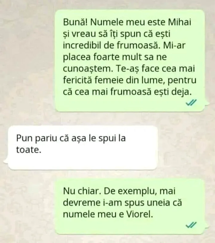 – Bună! Numele meu este Mihai şi vreau să îți spun că eşti incredibil de frumoasă. Mi-ar plăcea foarte mult sa ne cunoaștem. Te-aş face cea mai fericită femeie din lume, pentru că cea mai frumoasă eşti deja.