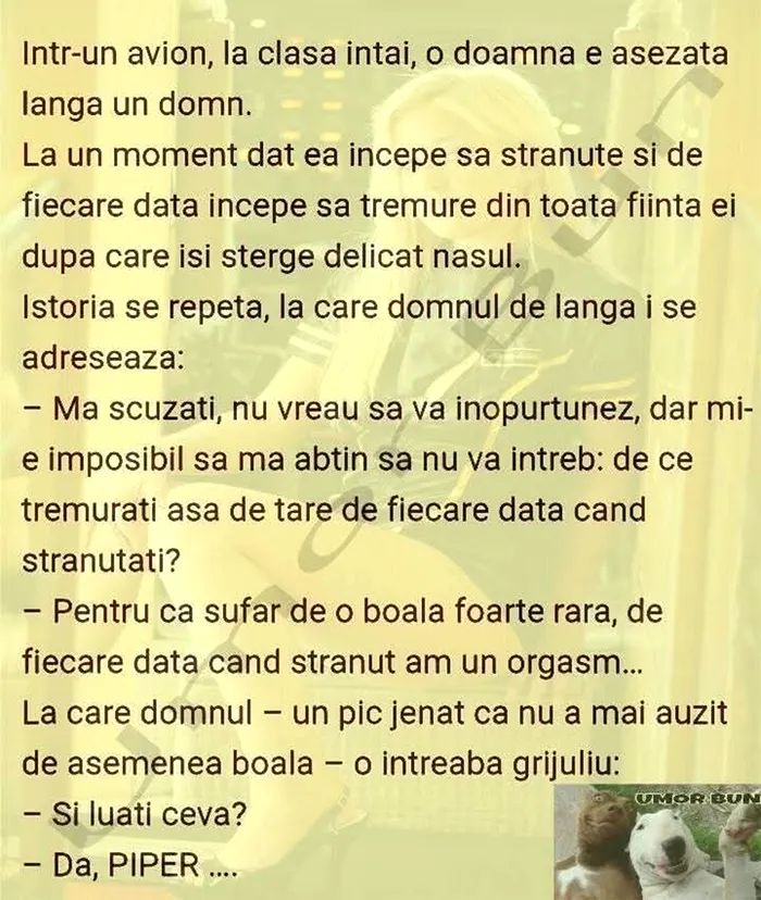 BANCUL ZILEI. O boală rarisimă. Într-un avion, la clasa întâi, o doamnă e așezată lângă un domn…