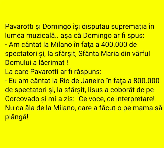 Dacă e sâmbătă, atunci e timpul să vă delectăm cu un nou banc haios. De data aceasta, artiștii Pavarotti și Domingo își dispută supremația în lumea muzicală. Iată cum sună bancul!