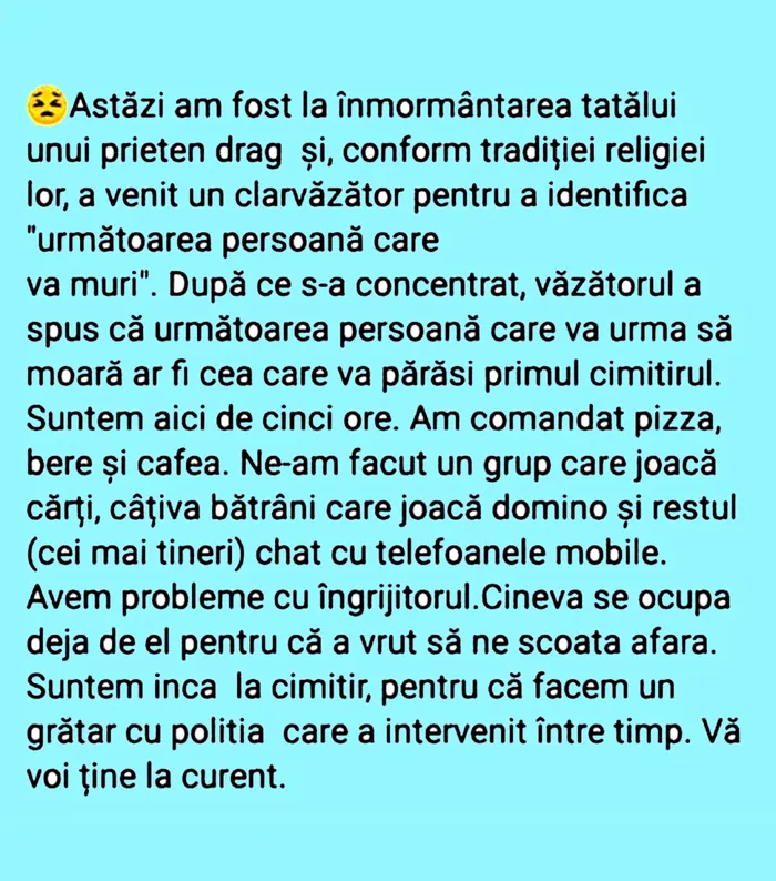 Bancul zilei. Încheiem săptămâna cu un nou banc spumos. Este vorba despre predicția macabră a clarvăzătorului. Totul se întâmplă la o înmormântare. Iată bancul!