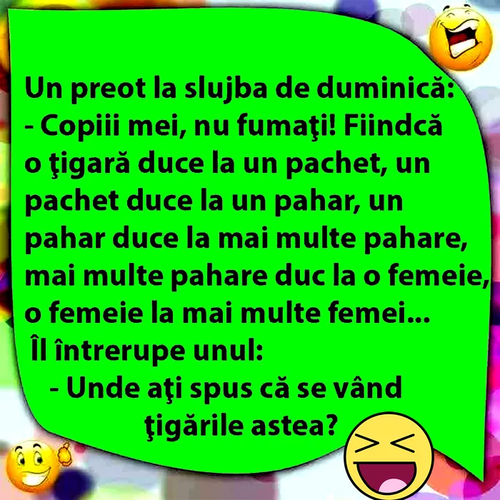 Bancul acestei zile este despre un preot care ține o predică, la slujba de duminică, prin intermediul căreia îi îndeamnă pe enoriașii săi să nu se apuce de fumat. Însă… acest sfat nu a fost prea bine interpretat.
