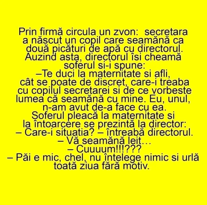 Prin firmă circulă un zvon: secretara a născut un copil care seamănă ca două picături de apă cu directorul.