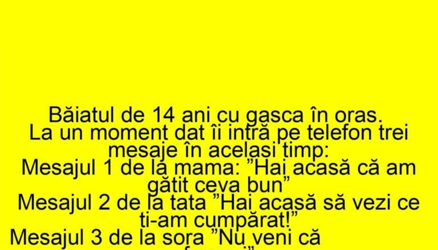 Băiatul de 14 ani cu gașca în oraș. La un moment dat îi intră pe telefon trei mesaje în același timp: