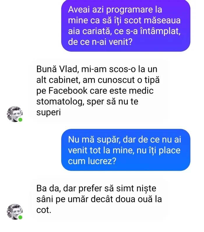„-Aveai azi programare la stomatolog să-ți scoți măseaua, aia cariată. Ce s-a întâmplat, de ce n-ai venit?