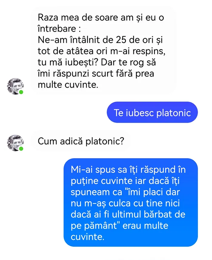 Ne-am întâlnit de 25 de ori și tot de atâtea ori tu m-ai respins. Tu mă iubești? Dar, te rog să îmi răspunzi scurt, fără prea multe cuvinte.