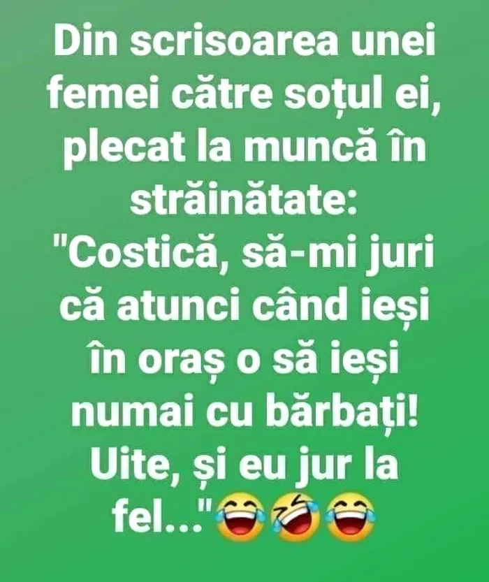 – Costică, să-mi juri că atunci când ieși în oraș, o să ieși numai cu băieți. Uite, și eu jur la fel…