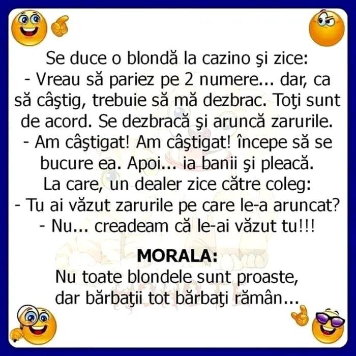 Bancul zilei. Puneți-vă zâmbetul pe buze cu bancuri savuroase! O blondă intră într-un cazino și pariază pe două numere. Însă, ca să câștige, trebuie să renunțe la haine, apoi să arunce zarul. Reacția bărbaților stârnește amuzamentul.