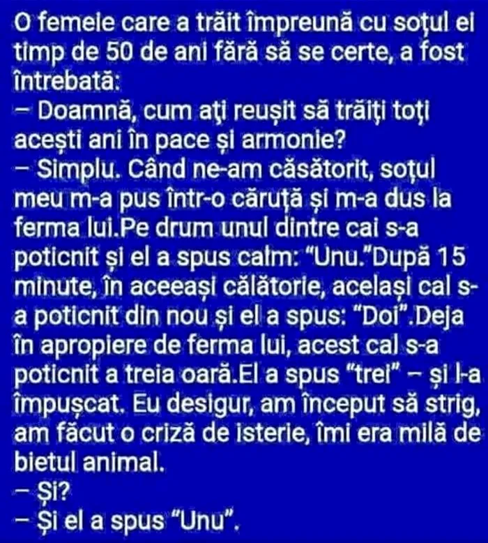 -Simplu. Când ne-am căsătorit, soțul meu m-a pus într-o căruță și m-a dus la ferma lui. Pe drum unul dintre cai s-a poticnit și el a spus calm: ”Unu”. După 15 minute, în aceeași călătorie, același cal s-a poticnit și el a spus calm: ”Doi”.