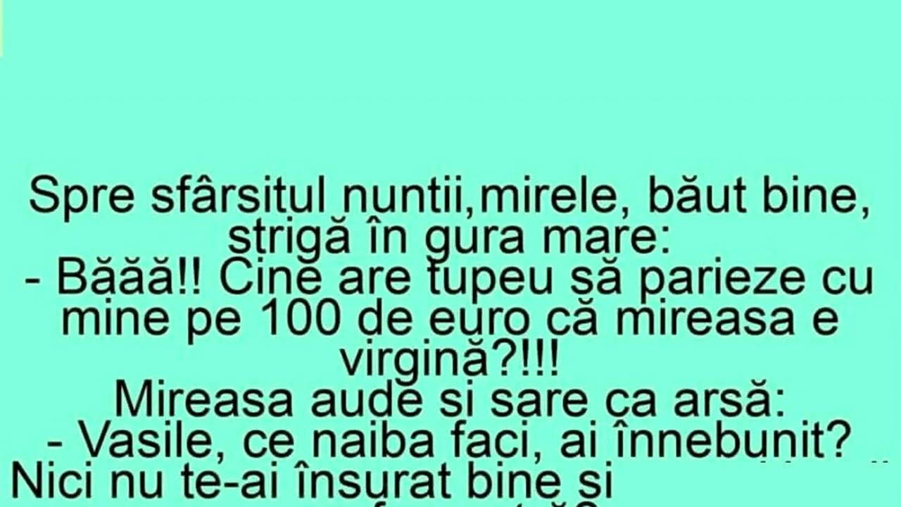 – Băăă!! Cine are tupeu să parieze cu mine pe 100 de euro că mireasa e virgină?!!