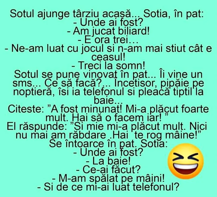 Soțul se pune vinovat în pat… Îi vine un sms… Ce să facă? Încetișor, pipăie pe noptieră, își ia telefonul și pleacă tiptil la baie… Citește: „A fost minunat! Mi-a plăcut foarte mult! Hai să o facem iar!”. El răspunde: „Și mie mi-a plăcut mult. Nici nu mai am răbdare. Hai te rog mâine!”