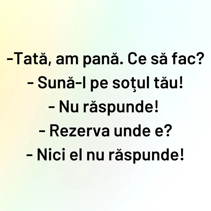 GÂNDUL.RO vă propune pentru azi un banc care să vă binedispună. Să continuăm ziua cu un zâmbet! Banc: „Tată, am pană, ce să fac?”.