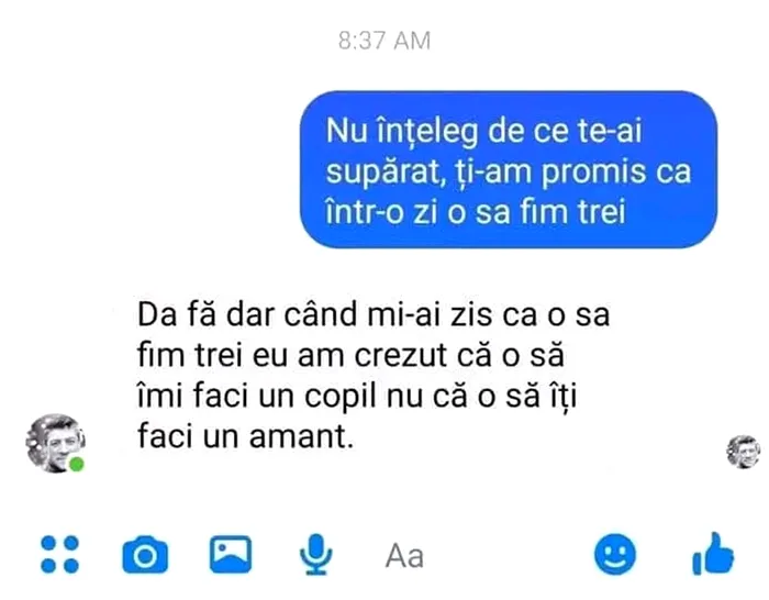 – Da, fă, dar când mi-ai zis că o să fim 3, eu am crezut că o să-mi faci un copil, nu că o să îți faci un amant.