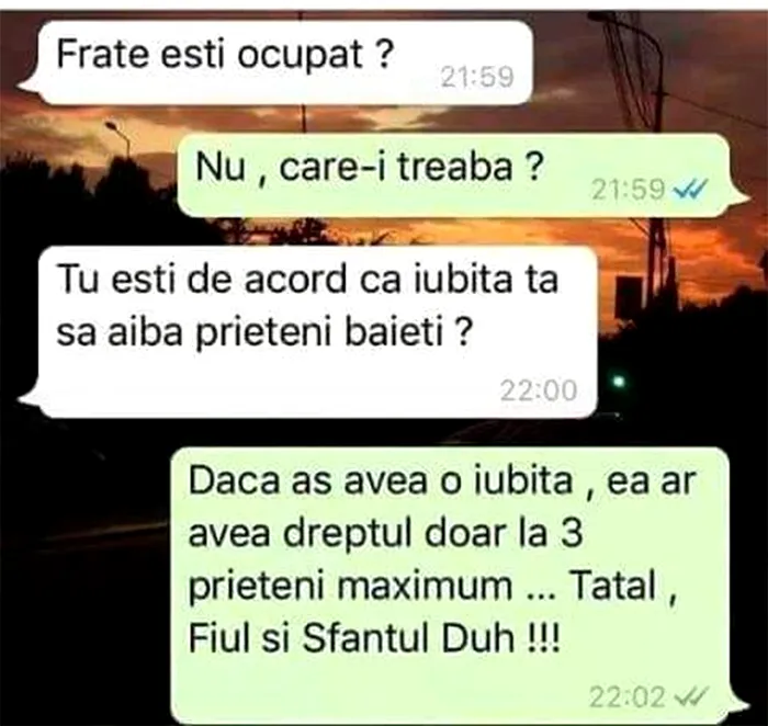 – Dacă aș avea o iubită, ea ar avea dreptul doar la 3 prieteni maximum… Tatăl, Fiul și Sfântul Duh!!!