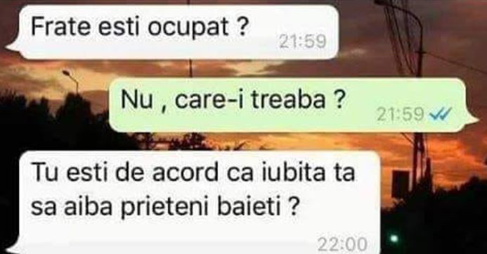 – Tu ești de acord ca iubita ta să aibă prieteni băieți?