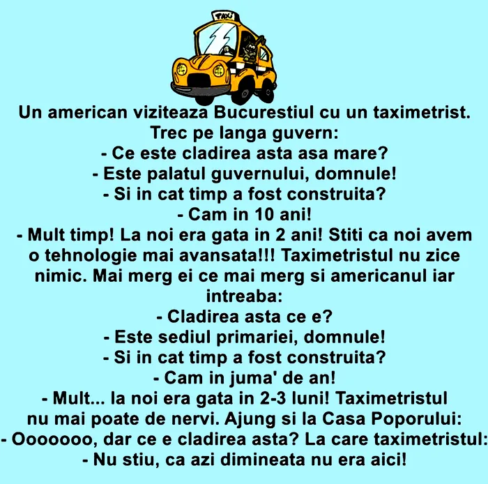 BANCUL ZILEI | Turistul american și taximetristul bucureștean. Bancul de duminică vă va aduce garantat zâmbetul pe buze.