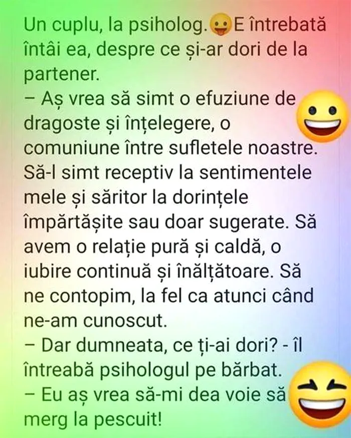 BANCUL ZILEI. Un cuplu, la psiholog. Ce se întâmplă când doi oameni merg să se „trateze” la un medic specializat? Iată bancul zilei de la „Gândul”, care vă va aduce garantat zâmbetul pe buze.