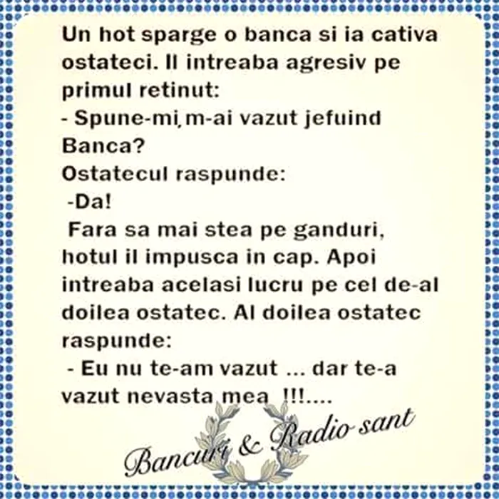 Ziua de sâmbătă începe cu un zâmbet pe chip. Redacția „Gândul” vă oferă un banc pentru toată familie: Un hoț sparge o bancă și ia ostatici.