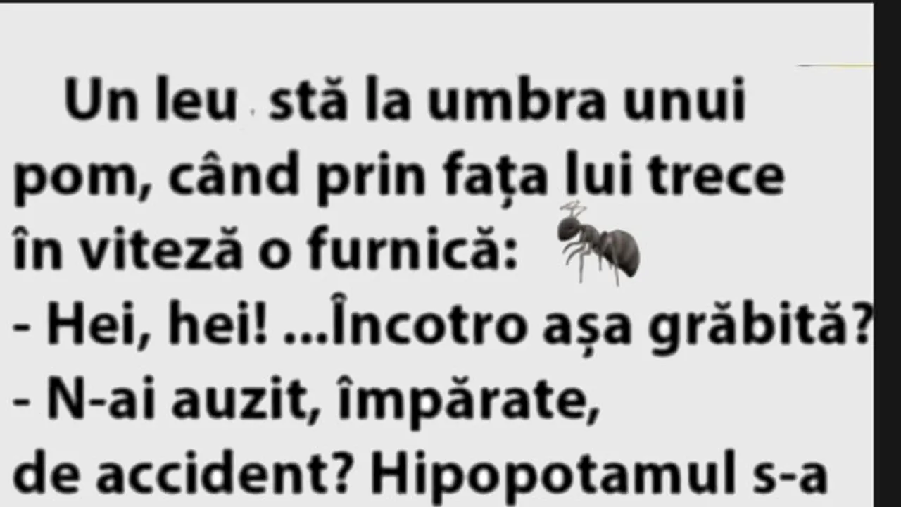 Un leu stă la umbra unui pom, când prin fața lui trece în viteză o furnică: