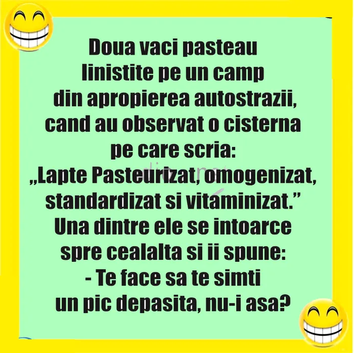 Să continuăm ziua cu un zâmbet pe chip, chiar dacă suntem abia la început de săptămână, iar weekend-ul este atât de departe. „Gândul” vă oferă bancul de marți: Vacile și laptele pasteurizat.