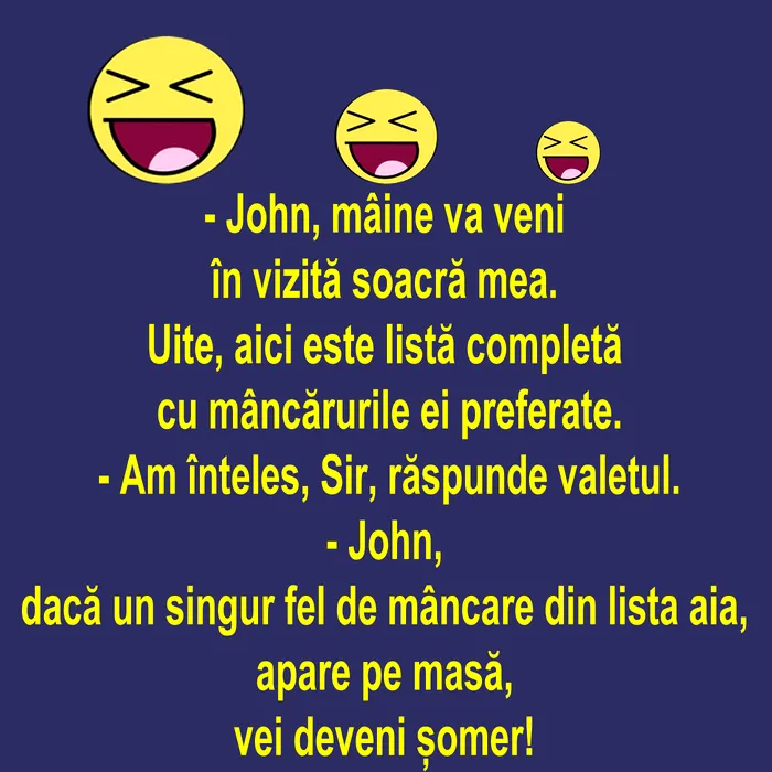 – John, mâine va veni în vizită soacră mea. Uite, aici este listă completă cu mâncărurile ei preferate.