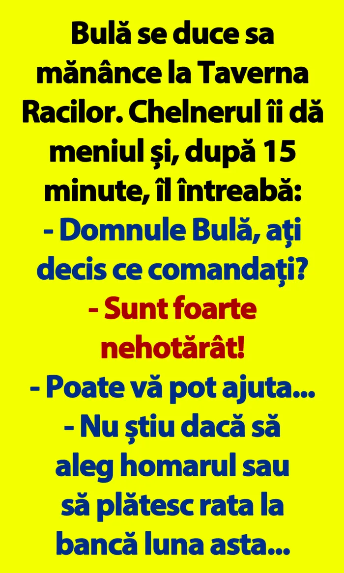Bulă se duce sa mănânce la Taverna Racilor. Chelnerul îi dă meniul și, după 15 minute, îl întreabă: