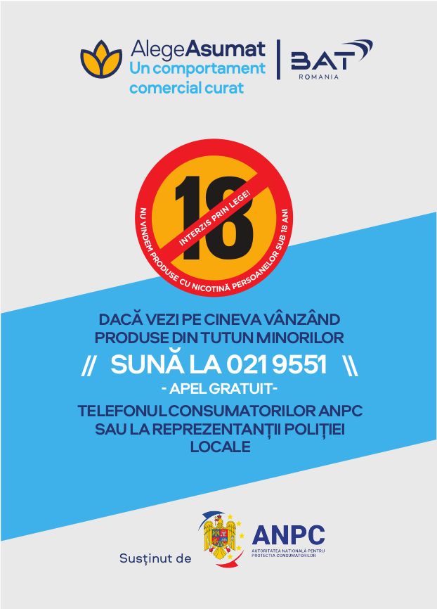 BAT în parteneriat cu Autoritatea Națională pentru Protecția Consumatorilor (ANPC) lansează campania anuală Alege Asumat un Comportament Comercial Curat, un proiect de informare și conștientizare publică cu privire la importanța cunoașterii și respectării legislației pentru prevenirea accesului minorilor la produse din tutun și nicotină. Anul acesta, campania continuă cu mesaje de conștientizare privind toleranța zero față de comercializarea produselor cu nicotină către minori, în circa 32.000 de magazine partenere din România.