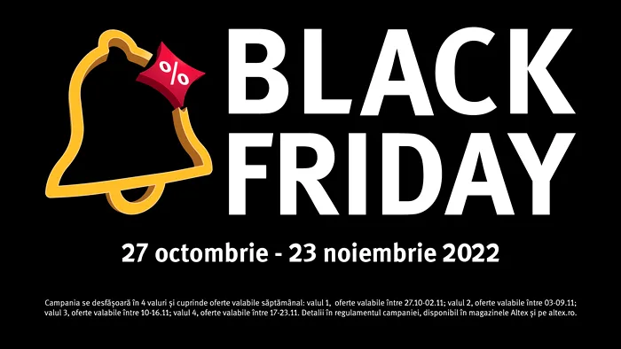 ”La Altex, campania de Black Friday din acest an include patru valuri cu oferte săptămânale pentru diferite categorii de produse. Ofertele sunt valabile doar în săptămâna în care acestea sunt lansate. Clienții pot opta pentru comanda online sau aplicația mobilă Altex sau cumpărături direct în magazinele noastre”