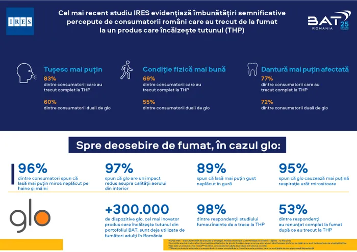 Rezultatele acestui studiu se adaugă volumului din ce în ce mai crescut de dovezi științifice care susțin glo ca o alternativă mai puțin riscantă** pentru fumătorii adulți care nu ar renunța la fumat. Toate acestea sunt instrumente relevante pentru o mai bună informare a consumatorilor și autorităților de reglementare cu privire la potențialul produselor care încălzesc tutunul în strategiile de reducere a efectelor nocive ale fumatului”, a declarat Ileana Dumitru, Director Juridic și Relații Publice al Ariei Europa Centrală și de Sud, BAT.