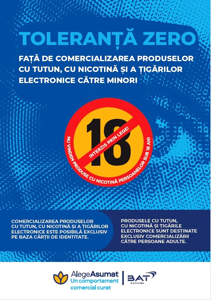BAT România lansează luna aceasta campania anuală „Toleranță Zero față de comercializarea produselor din tutun și nicotină către minori”, o inițiativă multianuală care își propune să informeze și să crească nivelul de conștientizare publică privind importanța respectării legislației menite să prevină accesul minorilor la produse din tutun și nicotină. Campania BAT se desfășoară la nivel național în aproximativ 32.000 de magazine partenere, precum și prin afișaj stradal în zone centrale din București.
