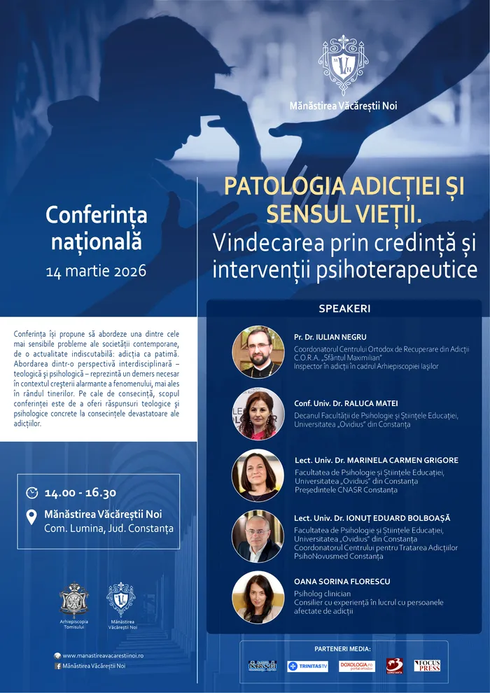Mănăstirea Văcăreștii Noi organizează sâmbătă, 14 martie 2026, conferința „Patologia adicției și sensul vieții. Vindecarea prin credință și intervenții psihoterapeutice”, un eveniment dedicat uneia dintre cele mai alarmante provocări ale prezentului: adicțiile. Conferința are loc cu binecuvântarea Înaltpreasfințitului Teodosie, Arhiepiscopul Tomisului, între orele 14:00 – 16:30, la Sala Justin Pârvu a complexului monahal.