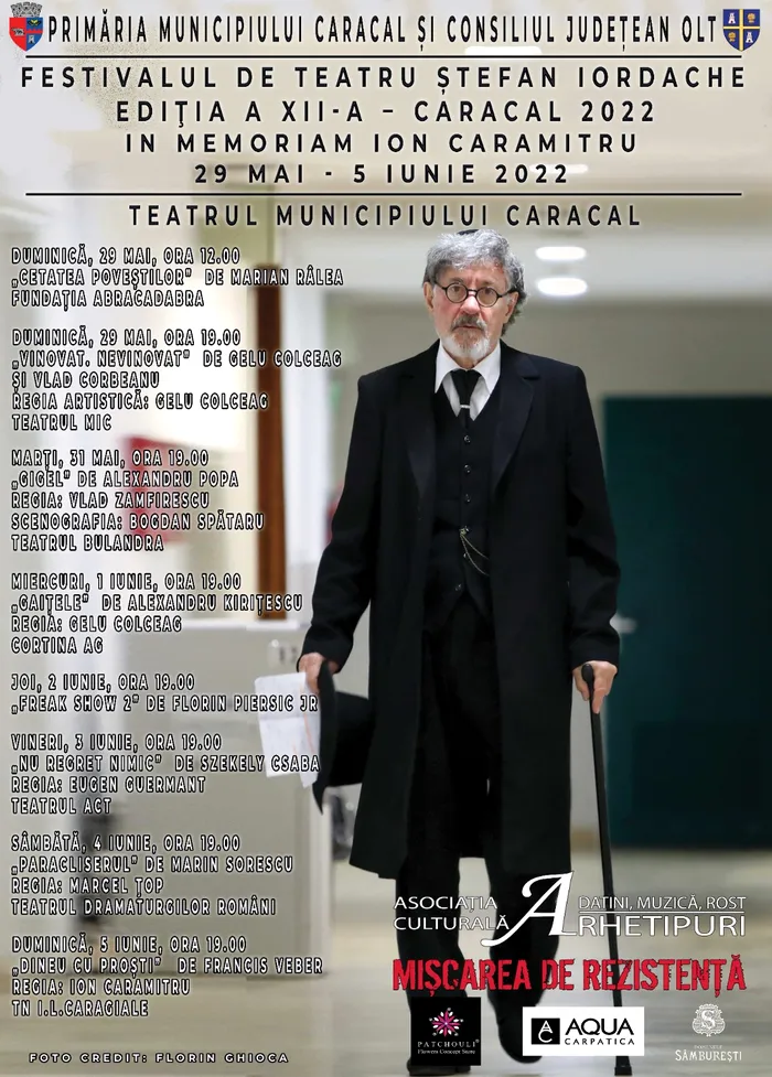 Așadar, în perioada 29 mai-5 iunie 2022, Fundația Culturală Arhetipuri – Datini, Muzică, Rost, împreună cu Mișcarea de Rezistență organizează, la Caracal, Festivalul de Teatru Ștefan Iordache, ediția a XII-a, In Memoriam Ion Caramitru, cu următorul program: