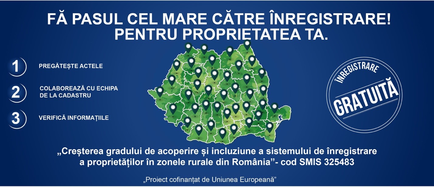 Agenția Națională de Cadastru și Publicitate Imobiliară (ANCPI) derulează, gratuit, lucrări de înregistrare sistematică a proprietăților în sistemul integrat de cadastru și carte funciară. Finanțarea este asigurată din veniturile proprii ale ANCPI, prin Programul Național de Cadastru și Carte Funciară (PNCCF), din fonduri europene nerambursabile, dar și din bugetele primăriilor. ANCPI este beneficiarul Proiectului major „Creșterea gradului de acoperire și incluziune a sistemului de înregistrare a proprietăților în zonele rurale din România”, care completează obiectivul PNCCF prin realizarea lucrărilor de înregistrare sistematică pentru 5.758.314 de hectare, din 660 de UAT-uri din zonele rurale ale României, iar valoarea totală a Proiectului este 312.891.155 de euro.