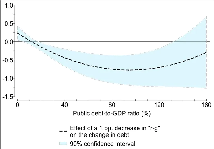 Practic, un ’r-g’ negativ este benefic pentru evoluția datoriei publice în sensul că atenuează din creșterea datoriei publice ca pondere în PIB. În literatura de specialitate, contribuția autonomă a diferențialului dintre rata dobânzii (r) și rata de creștere economică (g) asupra dinamicii datoriei publice poartă numele de efect al bulgărelui de zăpadă (snowball). Boussard și Mohl (2021), în lucrarea Fiscal policy in a negative interest rate-growth differential environment – new evidence, subliniază faptul că, la nivelul Uniunii Europene, impactul diferențialului ’r-g’ asupra datoriei publice este unul neliniar. Mai exact, impactul diferențialului ’r–g’ este cu atât mai mare cu cât nivelul datoriei este mai mare, însă până la un punct, după care nivelul impactului începe să scadă.