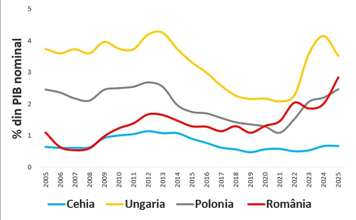 De exemplu, Ungaria are cea mai mare datorie publică din regiune ca pondere în PIB nominal. Acest aspect se reflectă și în evoluția cheltuielilor pentru serviciul datoriei publice. În cazul țării noastre, creșterea abruptă a datoriei publice după izbucnirea pandemiei de Covid-19 a survenit concomitent cu o creștere semnificativă a costurilor cu dobânzile pentru datoria publică. Dacă ne uităm la anul 2022, putem observa că țara noastră a avut o cheltuială cu dobânzile (exprimată ca pondere în PIB) care a depășit-o pe cea a Poloniei, devenind a doua cea mai ridicată din regiune, situație care s-a menținut până în prezent.