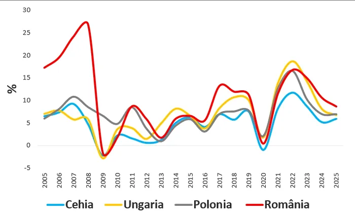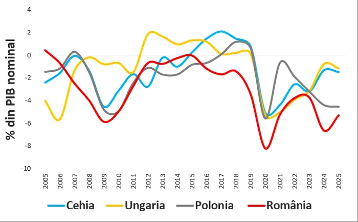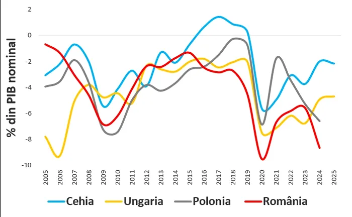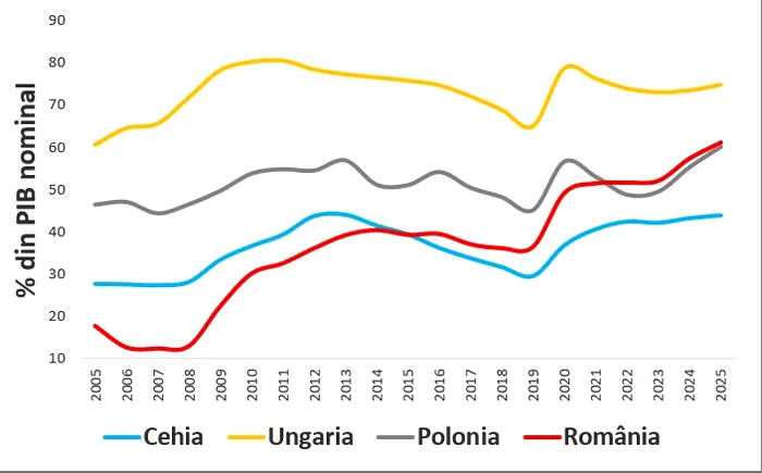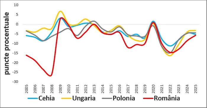 Pentru perioada considerată, 2005-2025, diferențialul ’r–g’ a fost preponderent negativ. Totodată, el crește și poate ajunge în teritoriu pozitiv atunci când creșterea nominală a PIB se reduce semnificativ și poate fi chiar negativă (contracție economică). În cazul țării noastre, diferențialul ’r–g’ s-a situat, în general, sub nivelul înregistrat în cazul celorlalte țări din regiune.