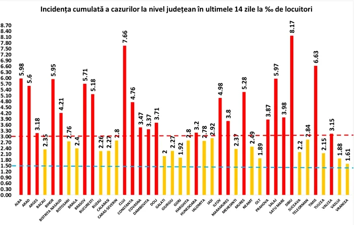 Coeficientul infectărilor cumulate la 14 zile, raportate la 1.000 de locuitori, calculat de către Direcțiile de Sănătate Publică, la nivelul Municipiului București și al județelor, a sărit pragul de 8/1.000 în județul Sibiu, după ce ieri era de 7,78/1.000.