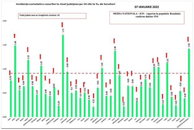 Media națională a incidenței cumulate a cazurilor pe 14 zile, raportată la populația României, este, joi, 0,91 la mie, în creștere față de ziua anterioară, când a fost 0,74 la mie.