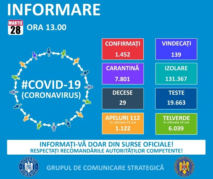 Până astăzi, 28 martie, pe teritoriul României, au fost confirmate 1.452 de cazuri de persoane infectate cu virusul COVID – 19 (coronavirus). Dintre cele 1.452 de persoane confirmate pozitiv, 139 au fost declarate vindecate și externate (54 la Timișoara, 55 la București, 16 la Iași, 6 la Craiova, 6 la Constanța și 2 la Cluj), anunță Grupul de Comunicare Strategică.