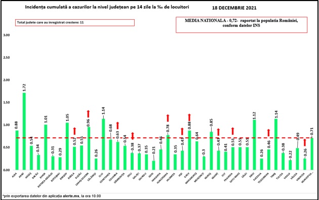 Media națională a incidenței cumulate a cazurilor pe 14 zile, raportată la populația României, a ajuns, sâmbătă, la 0,72 la mie.