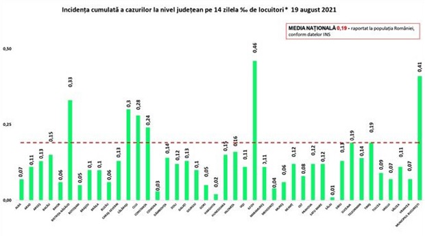 Din cele 595 cazuri noi de persoane infectate cu SARS – CoV – 2, cele mai multe, 136, au fost raportate în municipiul București – unde e și cea mai mare incidență în ultimele 14 zile, la 1000 de locuitori, de 0,4 – iar 52, în județul Ilfov. La nivel național, incidența de de 0,19 la mia de locuitori, la data de 19 august.