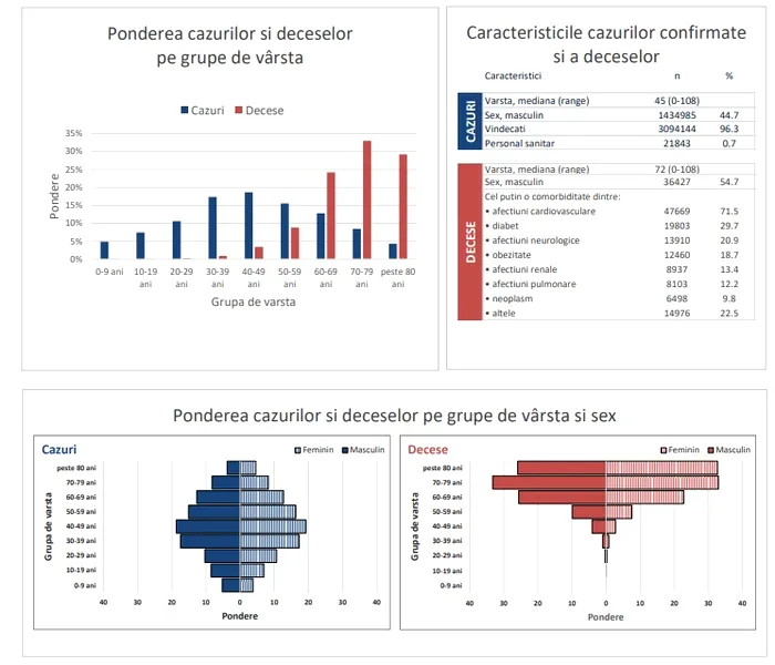 De la începutul pandemiei până în 28 august, 86.4% din totalul deceselor au fost la persoane peste 60 ani, iar 54.7% din decese au fost la bărbați. 93.7% din decedați aveau cel puțin o comorbiditate asociată, potrivit INSP.