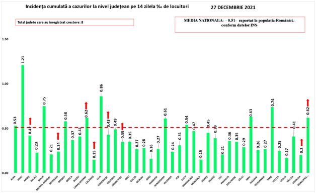Coeficientul infectărilor cumulate la 14 zile, raportate la 1.000 de locuitori este calculat de către Direcțiile de Sănătate Publică, la nivelul Municipiului București și al județelor. Mai jos, graficul realizat în baza raportărilor primite de CNCCI de la Direcțiile de Sănătate Publică: