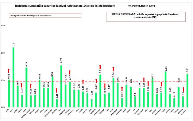 Media națională a incidenței cumulate a cazurilor pe 14 zile, raportată la populația României, a ajuns, miercuri, la 0,48 la mie, în scădere față de ziua anterioară, când a fost 0,49 la mie.