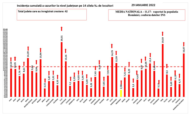 În total, până astăzi, 29 ianuarie, pe teritoriul României au fost înregistrate 2.176.726 de cazuri de infectare cu noul coronavirus (COVID – 19), dintre care 47.823 sunt ale unor pacienți reinfectați, testați pozitiv la o perioadă mai mare de 180 de zile după prima infectare.