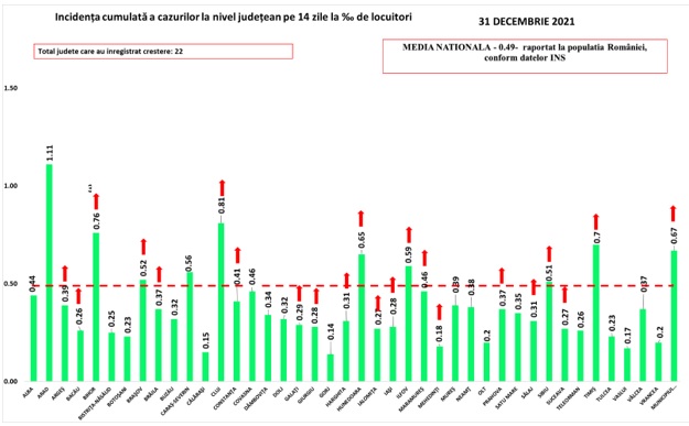 Media națională a incidenței cumulate a cazurilor pe 14 zile, raportată la populația României, a este, vineri, 0,49 la mie, în creștere față de ziua precendentă când a fost 0.48 la mie.