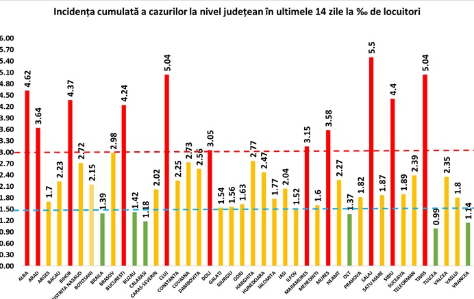 Coeficientul infectărilor cumulate la 14 zile, raportate la 1.000 de locuitori ,calculat de către Direcțiile de Sănătate Publică, la nivelul Municipiului București și al județelor, înregistrează cea mai mare valoare în județul Sălaj, cu 5,5 cazuri la mia de locuitori, față de 5,2/1.000, raportată marți. Pragul de 5 la mie este depășit și în Timiș și în Cluj.