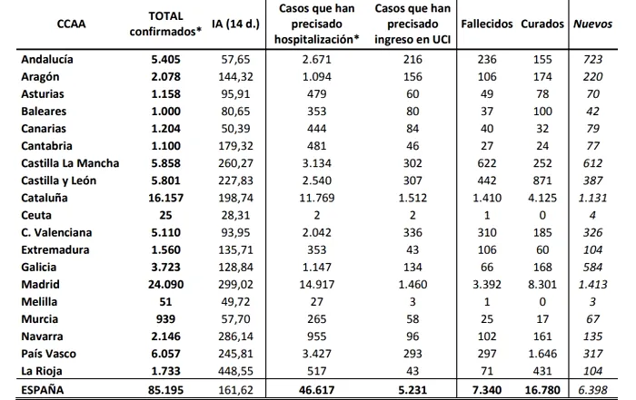 Spania a depășit China la numărul de îmbolnăviri cauzate de COVID-19 după ce în cursul zilei de luni, 30 martie, Ministerul Sănătății din Spania a anunțat că au fost confirmate 85.195 cazuri de infectare.