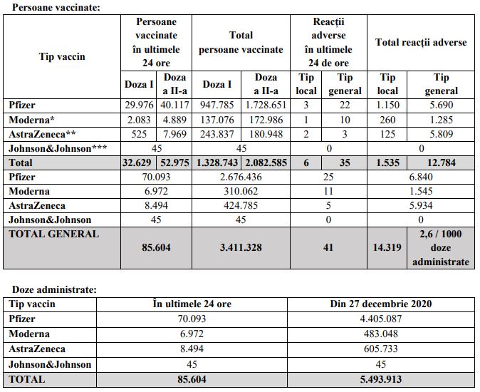 De la începutul campaniei de vaccinare, 27 decembrie 2020, au fost administrate 5.493.913 doze de vaccin: